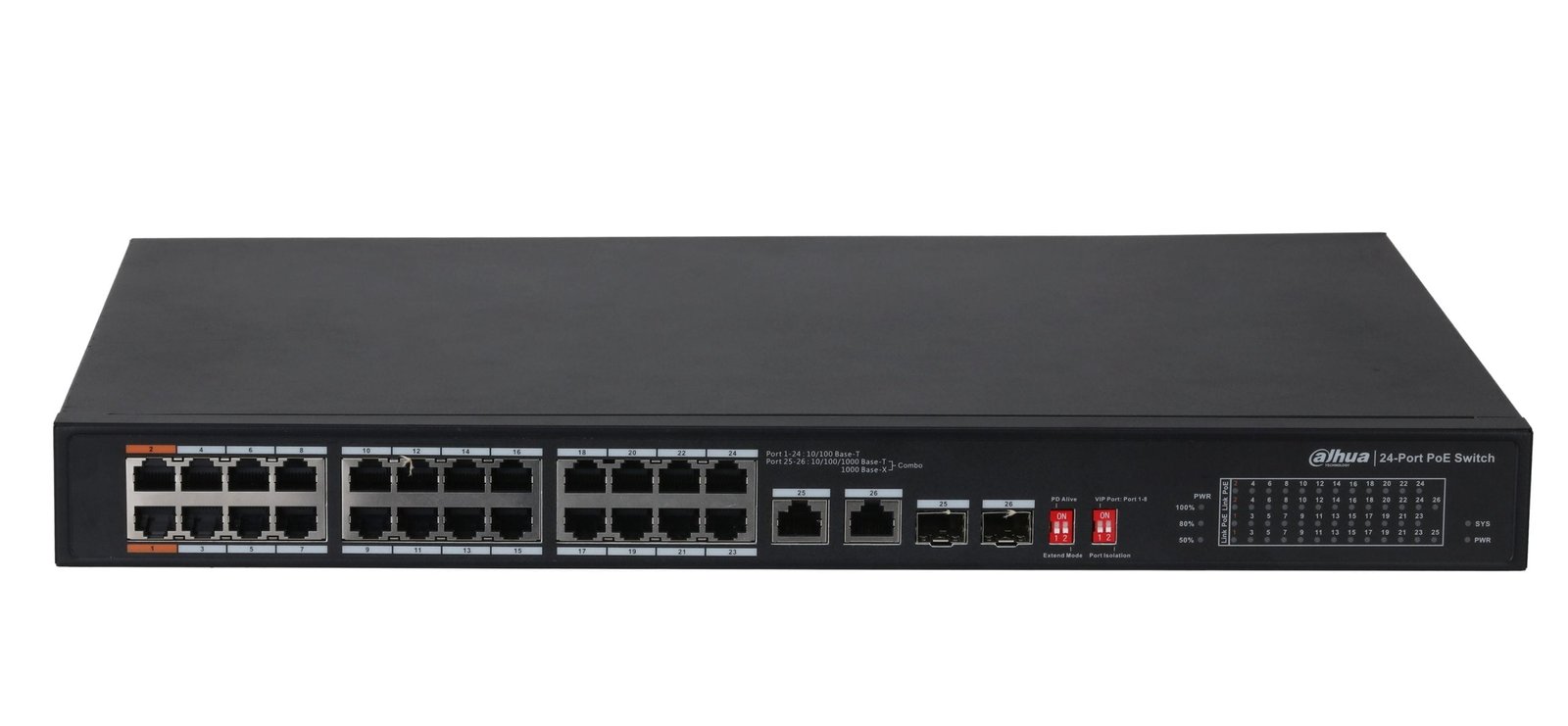 26 პორტიანი ქსელური გამანაწილებელი 24xPOE პორტი.